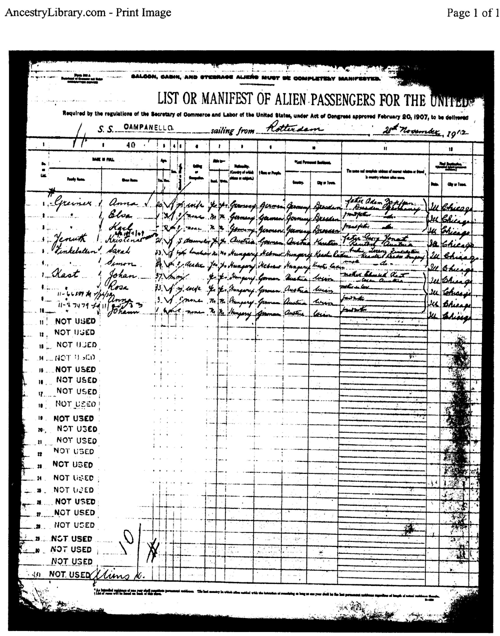 Passenger manifest of the Campanello listing Johann, Rosa, Anna and John
